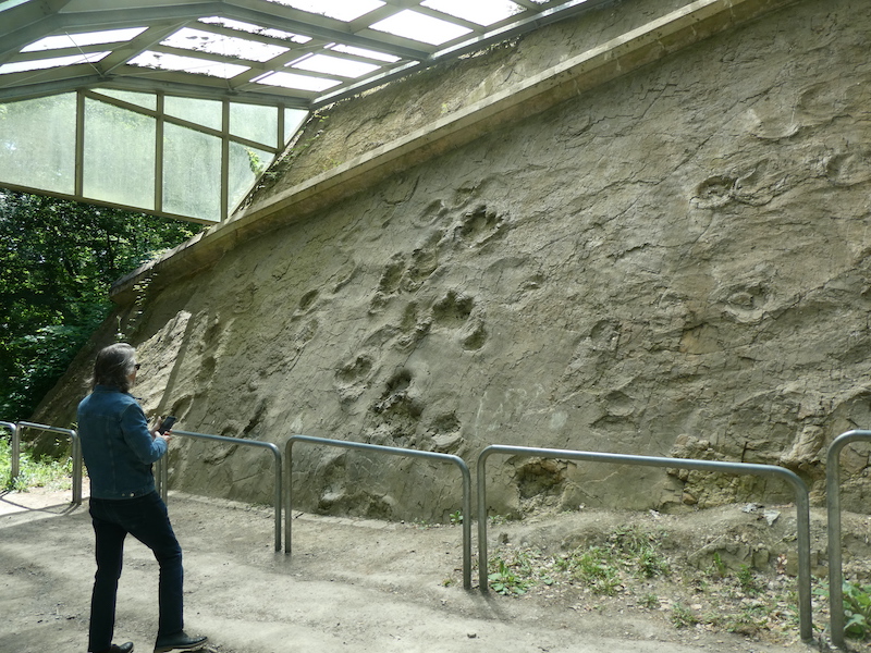 Today, the tracks appear to walk up the wall. The land where the dinosaurs walked has been pushed up over 150,000 years. Click here for further information on this site (in English) and click here for the Saurierfährten website.