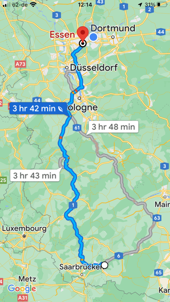 The directions from Google maps said 3hr 42 mins but in practice we had a very long (five hours) drive up from Homburg to Essen. There are a lot of roadworks in this area which slows the traffic down (reminds me of England).