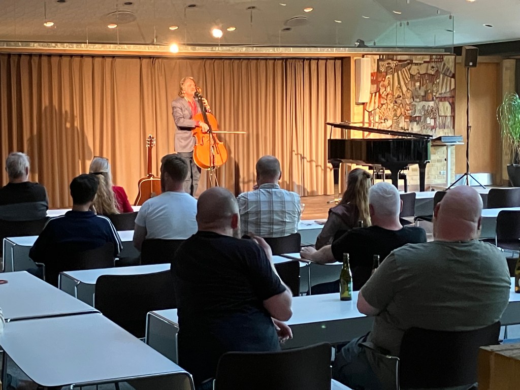 The first gig for Ray was a house concert in Copenhagen. He drove down from his home in Sweden and over the Oresund bridge. It was a long journey with an overnight stop. Although called a house concert, it was held in the communal room of a block of flats. The residents all eat together there on Mondays to Thursdays, taking it in turns to cook. This was the first time they have had a music concert and it worked so well that Ray has been invited back for next year.