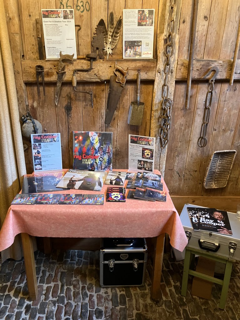 As can be seen on the merch desk at the entrance to the barn, there is a lot to squeeze in. Now in his eleventh year as a solo artist, Ray Cooper has five solo albums on CD – Tales Of Love War And Death By Hanging; Palace Of Tears; Between The Golden Age And The Promised Land; Land Of Heroes and Even For A Shadow. The last three albums are also on vinyl with Even For A Shadow produced on 180gm vinyl with a gatefold sleeve. He also has a CD single with three versions of Falling Like Thunder and a songbook covering songs from his first two albums.