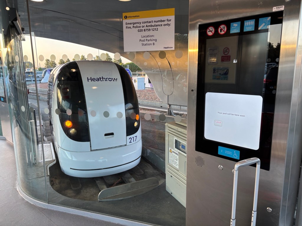 I had to get a very early flight, 6.55 am, so as to be in time for tonight’s first gig. I booked at the Thistle Hotel right next to Heathrow and was looking forward to taking the Heathrow Pod from terminal 5 to the business car park and the hotel. I got off the airport bus and followed the signs to Heathrow Pods. Very understated but then as it’s the link to the business car part maybe you’d expect it to be. I arrived at the pod station and saw a couple get on their Pod. Looks very futuristic. You walk up to one of the pod gates and tap the screen to choose which destination you need – A for the business car park and B for the Thistle Hotel. I tapped B and a pod approached, parked and the doors opened. I got in, sat down and waited for something to happen. Nothing did. Then I noticed the buttons which looked like those you get on the toilets on Virgin Trains. They said “Close Doors”, “Start” and “Open Doors”. The only one illuminated was “Open Doors” which felt a bit odd. So I waited a bit more. Then I pressed the button on the other side to speak to someone to find out what was happening. The man’s voice was unintelligible and when I told him that for the third time he opened the doors for me to get out and used the PA outside to tell me and the others waiting that the Pod system had a fault and they would send a bus to fetch us. Definitely a let-down.