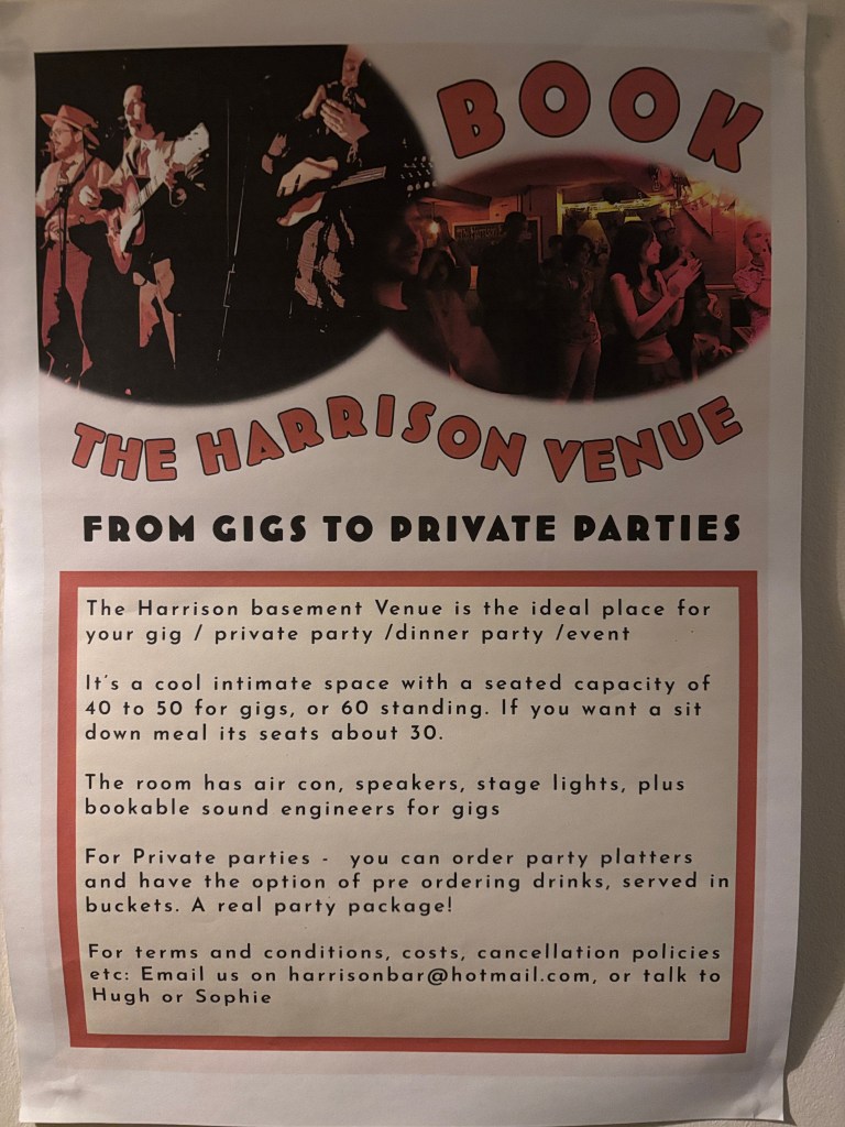 The basement hosts live events most evenings. It has a capacity of 40 to 50 people with a good sound system and lights.